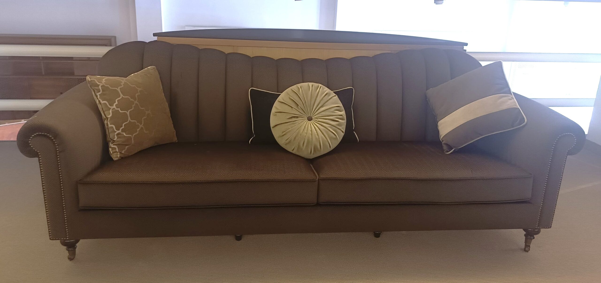 Material: Full fabric tufted English couch with hardwood legs on wheels