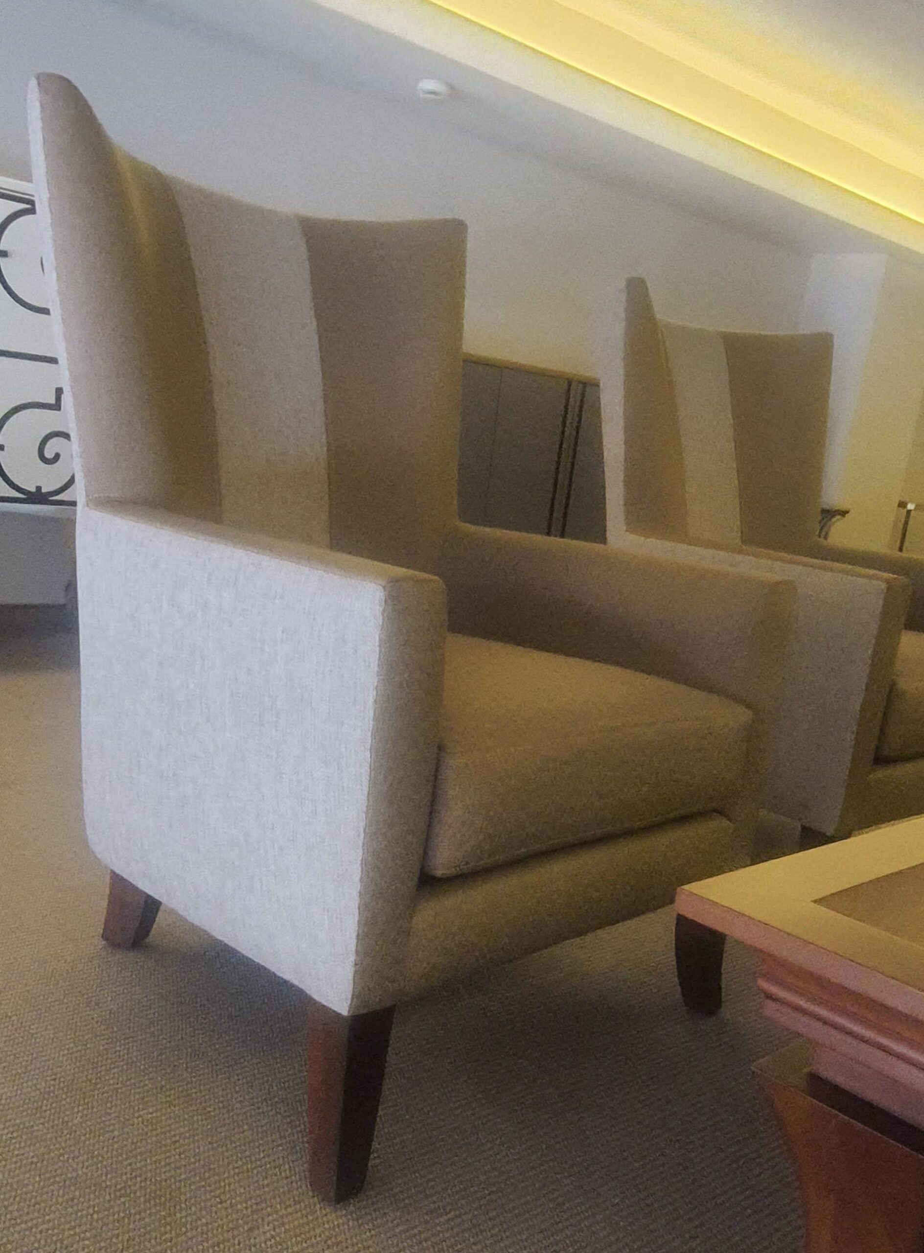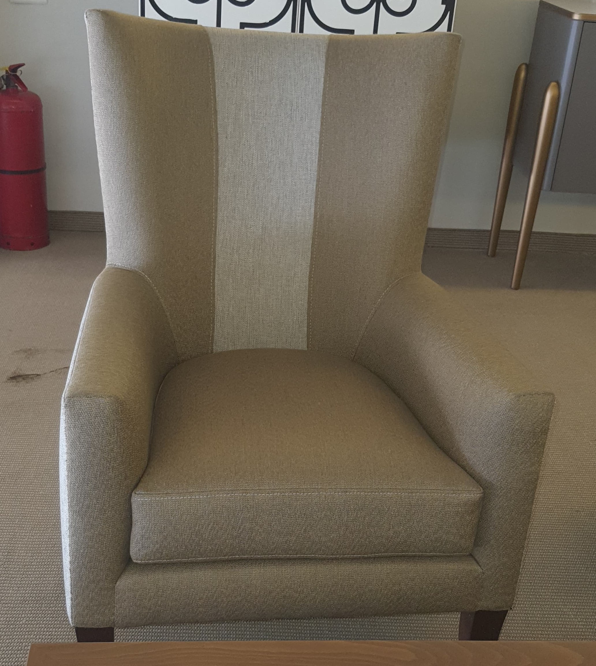 Material: Upholstered Bergère, full fabric, with beech hardwood legs, walnut color