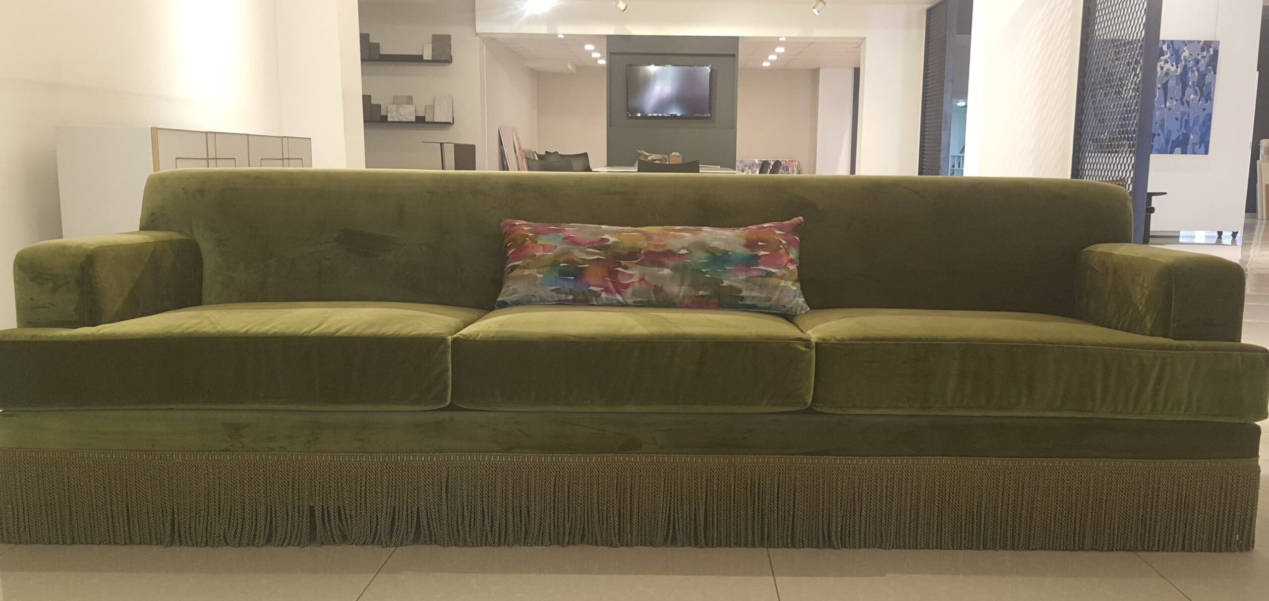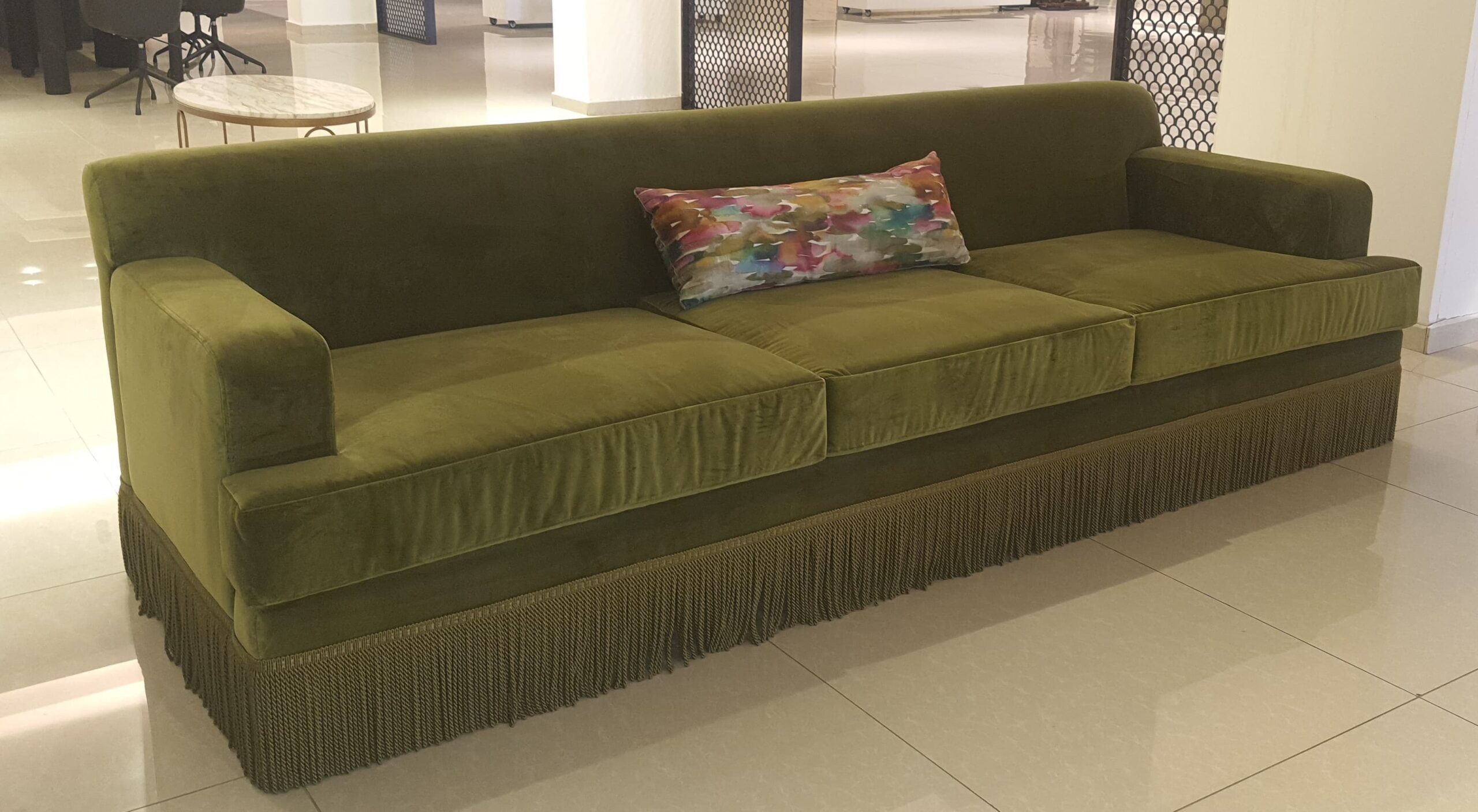 Material: Upholstered couch, fabric, velvet, with handmade fringe