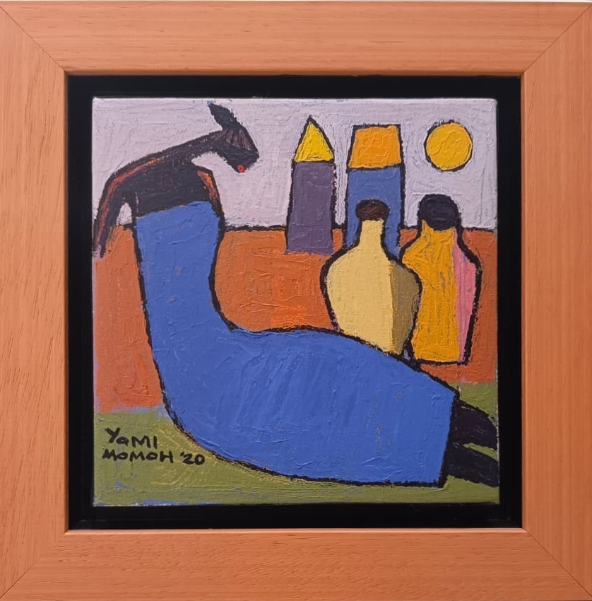 Yomi Momoh was born 1964 in Nigeria. He attended Ahmadu Bello University, Zaria graduating in 1989. He has since then worked as both a sculptor and painter. He sculpts in wood and fiber glass and paints in acrylic and oil. While his media may vary, his style is unmistakable, relying on simplicity in form and color to create strong visual images of everyday Nigeria. He has become a painter and sculptor of wistful Nigerian landscapes and people. The easy innocence of his scenes provide a backdrop for the exploration of the cultures and people he comes in contact with daily.