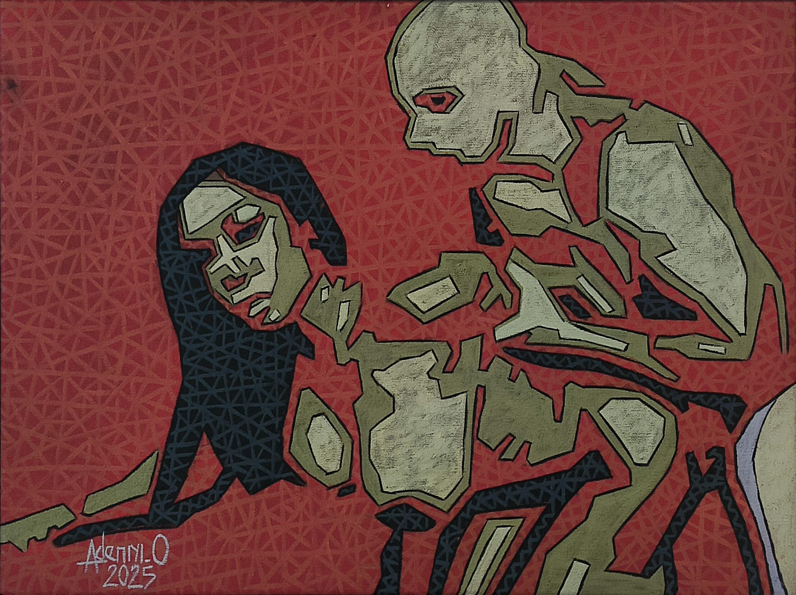 Adeniyi Olanrewaju (b. 1996) is a contemporary Nigerian artist whose work fuses urban narratives with quasi-digital aesthetics, exploring humanity’s struggle within challenging environments. Born in Alimosho, Lagos, he received informal training under renowned master Duke Asidere. Olanrewaju’s art translates personal experiences of resilience within Lagos’s complex urban landscape, serving as both intimate testimony and universal commentary.